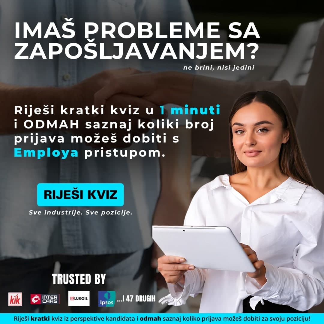 Dobivaš po 6 prijava na svoje oglase? Zasipan/a si životopisima stranih radnika? Misliš da nema više kvalitetnih radnika u Hrvatskoj? Prijave koje dobivaš su od nekvalificiranih radnika? 2025. je godina. Sve je digitalno, brzo i interaktivno - ali tvoji procesi zapošljavanja su isti kao prije 20 godina. Možda je upravo to razlog zašto misliš da nema kvalitetnih radnika? Employa pronalazi visokokvalificirane radnike putem oglasa na društvenim mrežama, ali u obliku kviza - bez životopisa. Riješi kratki kviz baš kao tvoji budući kandidati i saznaj koliko prijava možeš očekivati za svoju poziciju. Bez obveza. Bez prodajnih poziva.